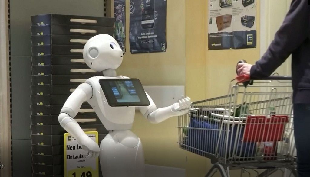 يظهر الفيديو: ROBOT “PEPPER” يذكر المتسوقين في السوبر ماركت خارج كولونيا للاحتفاظ بمسافة أمان تتراوح من 1.5 إلى 2 متر (5 – 6.5 قدم) بين كل شخص و ينشر الابتسامات على وجوه المتسوقين الألمان