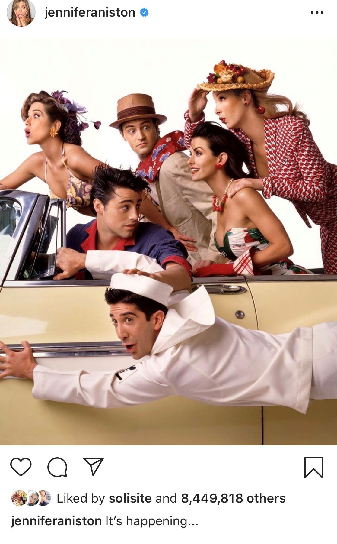 ونشر نجوم المسلسل، جينيفر أنيستون (رايتشل) وكورتني كوكس (مونيكا) وليزا كودرو (فيبي) وماثيو بيري (تشاندلر) ومات لو بلان (جوي) وديفيد شفيمر(روس)، على حساباتهم في “إنستغرام” صورة تجمعهم مرفقة بتعليق “هذا يحدث..”.