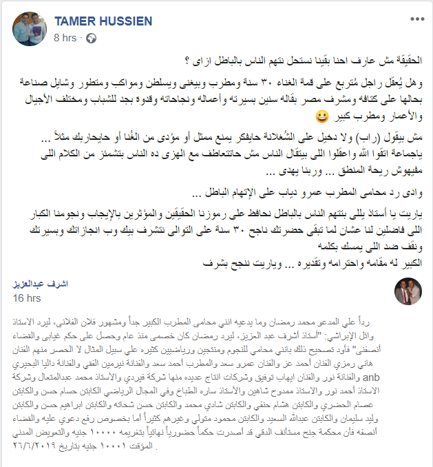 وعبر حسابه على “فيسبوك” كتب تامر: “الحقيقة أنا مش عارف احنا بقينا نستحل نتهم الناس بالباطل ازاي؟.. وهل يعقل راجل متربع على قمة الغناء 30 سنة ومطرب وبيغني ويسلطن ومواكب ومتطور وشايل صناعة بحالها على كتفه ومشرف مصر بقاله سنين.. مش بيقول “راب” ولا دخيل على الشغلانة هيفكر يمنع ممثل أو مؤدي من الغنا أو هيحاربك مثلا؟”.