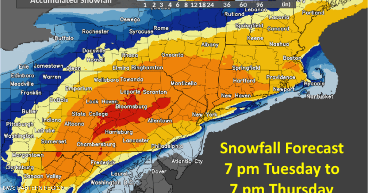 وقال خبراء الأرصاد في خدمة الطقس، إن مناطق وسط ولاية بنسلفانيا قد تشهد ثلوجا كثيفة يصل ارتفاعها إلى نحو 60 سنتيمترا. بينما قد تهطل ثلوج في بعض مناطق الشمال الشرقي خلال هذه العاصفة، تفوق مجمل الهطولات الثلجية في العام الماضي.