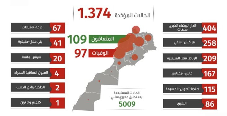 فيما يلي التوزيع الجغرافي لحالات الإصابة بفيروس كورونا حسب الجهات، وذلك إلى غاية الساعة السادسة من مساء اليوم الخميس 09 أبريل :