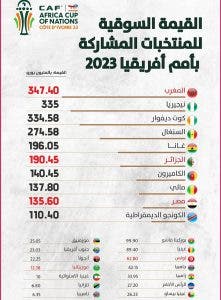 تصدر المنتخب المغربي قائمة المنتخبات المشاركة في بطولة كأس أمم أفريقيا 2023 من حيث القيمة السوقية، بـ347.40 مليون يورو، وبلغت القيمة السوقية لجميع المنتخبات المشاركة في البطولة 2.69 مليار يورو.