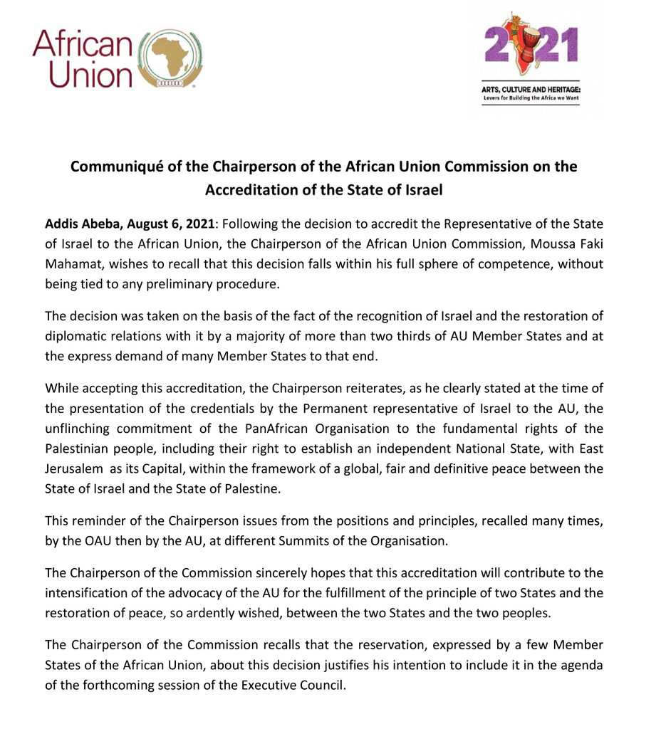 وأبرز بيان صحفي صادر عن مفوضية الاتحاد، أنه “على إثر قرار اعتماد ممثل دولة إسرائيل لدى الاتحاد الإفريقي، فإن رئيس مفوضية الاتحاد الإفريقي موسى فقي محمد يود التذكير بأن هذا القرار هو في صلب صلاحياته دون أن يكون قيد أي إجراء مسبق” .