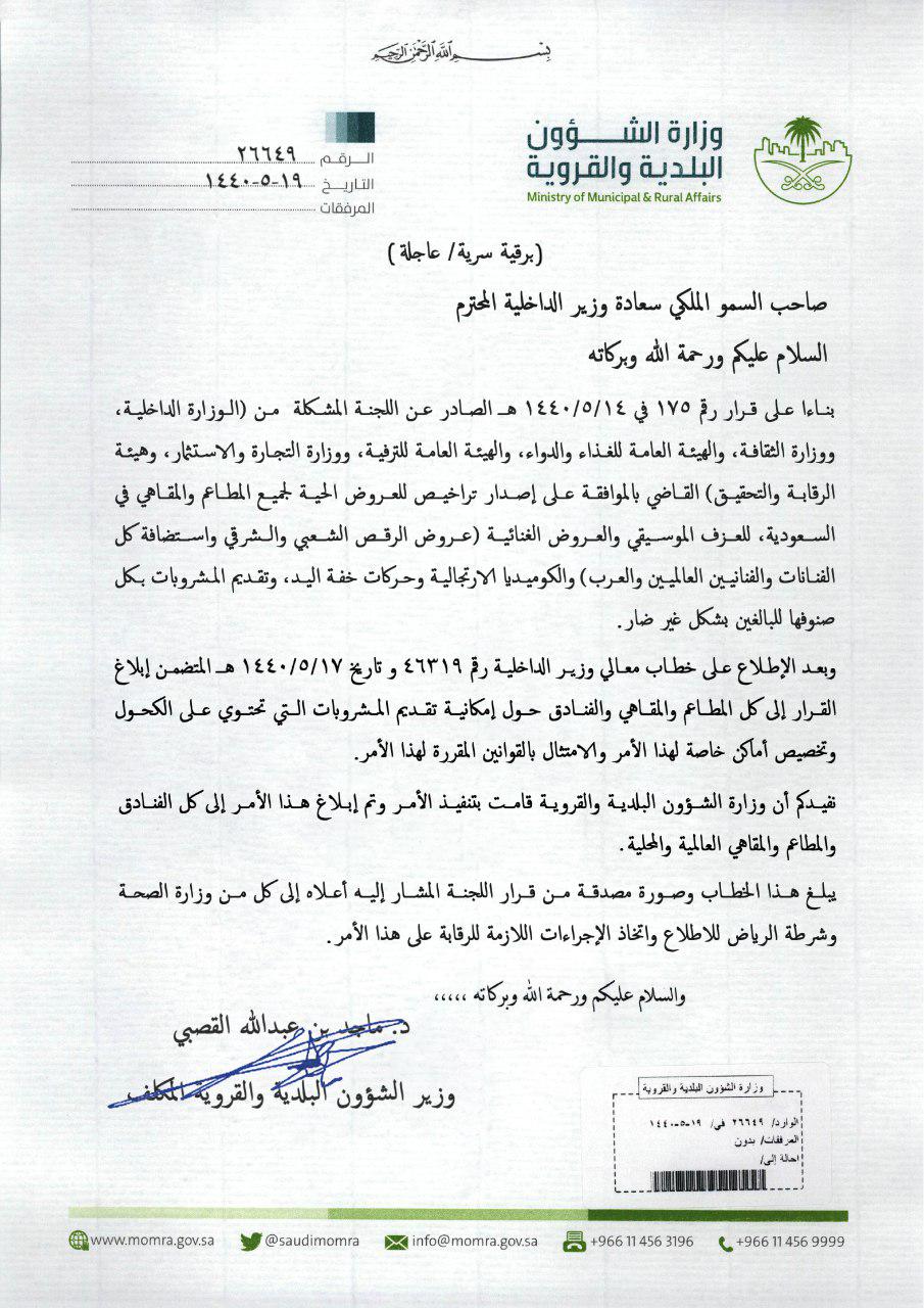 قامت وزارة الشؤون البلدية والقروية بالمملكة العربية السعودية بإصدار تراخيص لسلسلة المطاعم والمقاهي ومحلات العالمية والمحلية بتقديم المشروبات الكحولية لمن يطلبها.