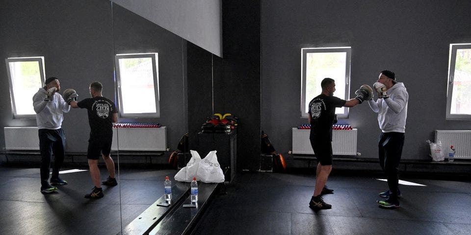 تمتزج أصوات موسيقى الهيب هوب مع ضجيج اللكمات المسددة لأكياس ثقيلة يتمرن عليها ملاكمون يحاولون تنفيس الضغط النفسي المتراكم جراء الحرب المستمرة منذ أسابيع في العاصمة الأوكرانية كييف.