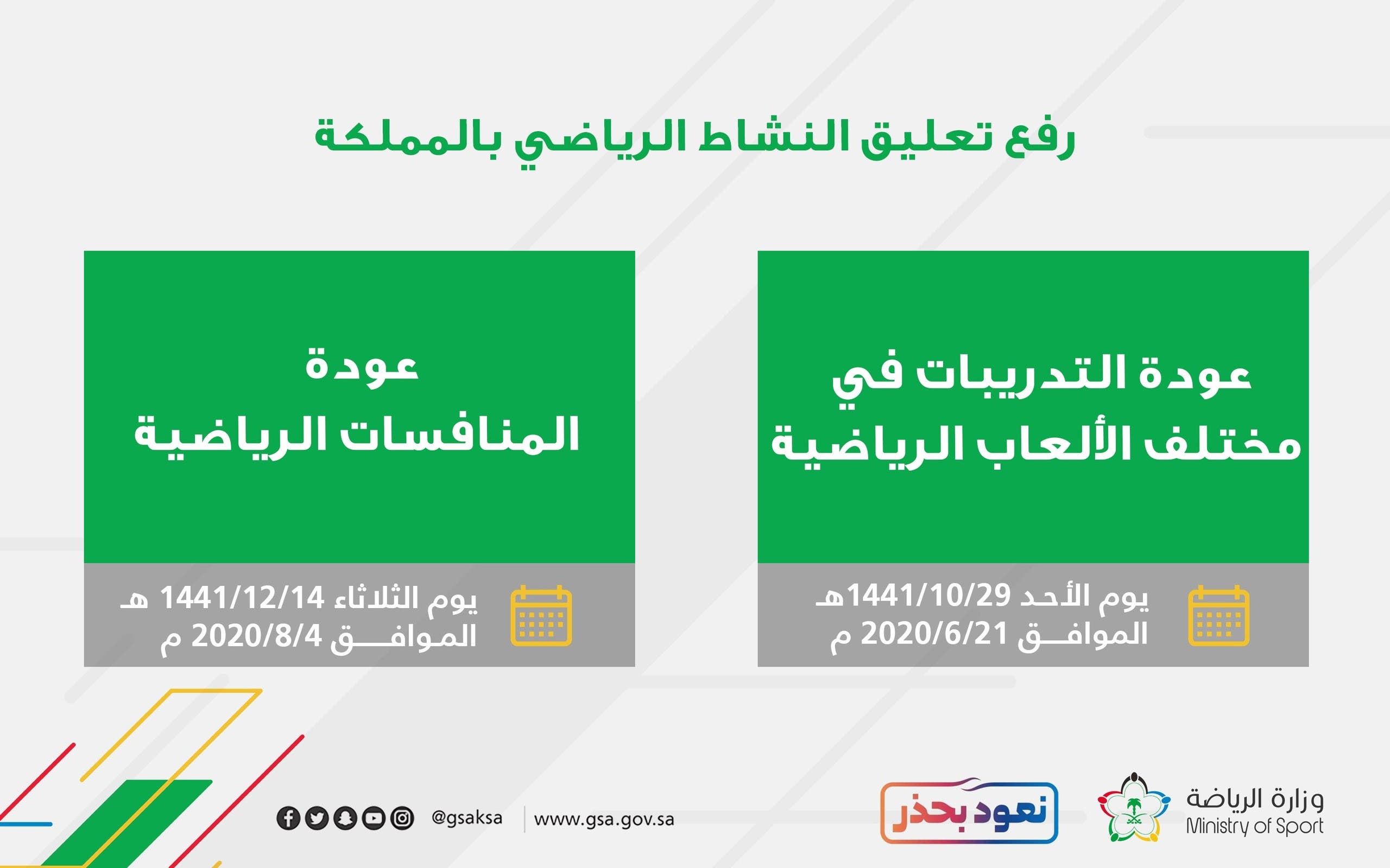 أعلنت وزارة الرياضة يوم الخميس رفع تعليق النشاط الرياضي في السعودية واستئناف تدريبات الأندية في 21 يونيو الجاري.
