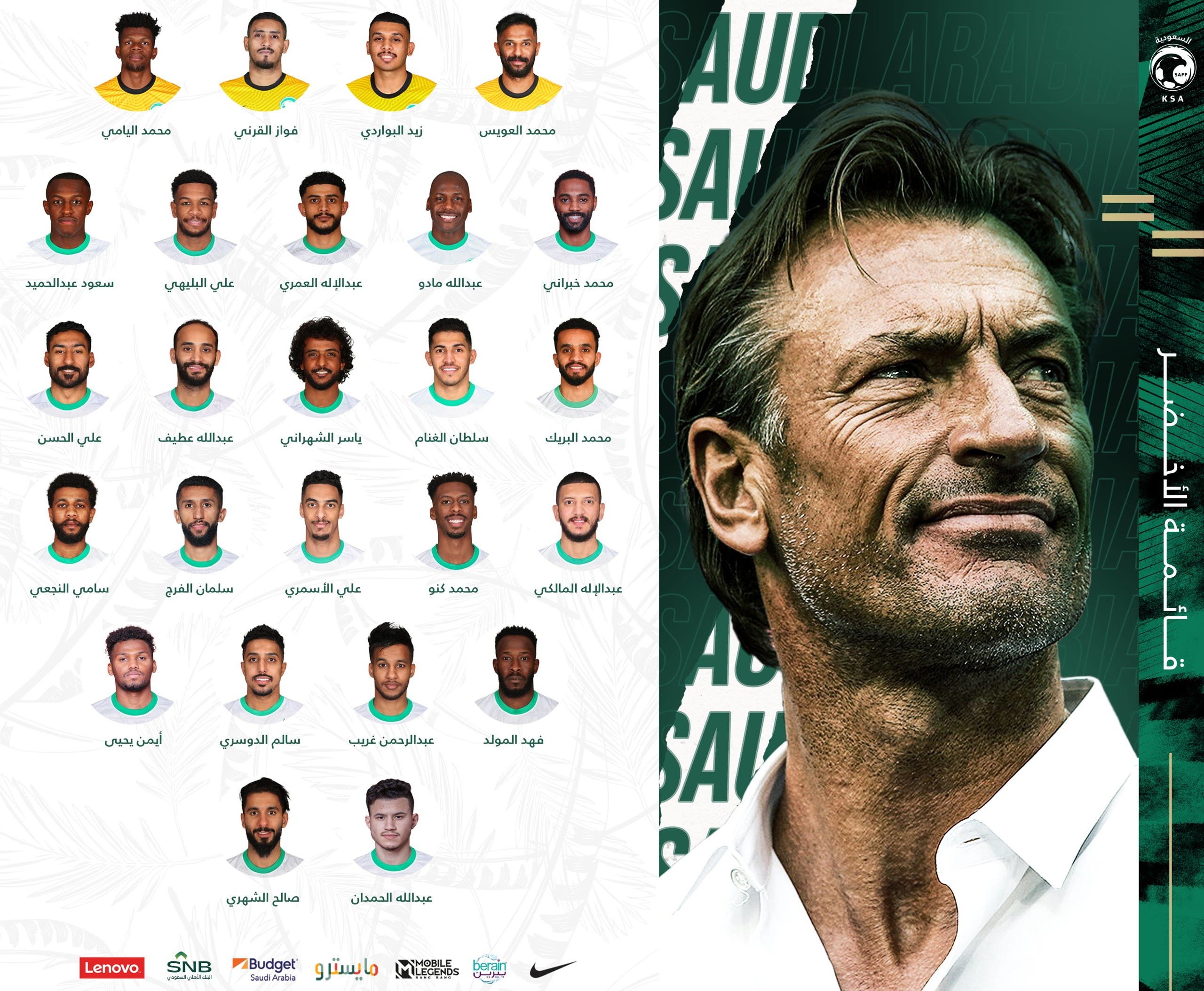 وضمت القائمة كلا من: محمد العويس وزيد البواردي وفواز القرني ومحمد اليامي “حراس مرمى”، إلى جانب محمد خبراني وعبدالله مادو وعبدالإله العمري وعلي البليهي وسعود عبدالحميد ومحمد البريك وسلطان الغنام وياسر الشهراني وعبدالله عطيف وعلي الحسن وعبدالإله المالكي ومحمد كنو وعلي الأسمري وسلمان الفرج وسامي النجعي وفهد المولد وعبدالرحمن غريب وسالم الدوسري وأيمن يحيى وعبدالله الحمدان وصالح الشهري.