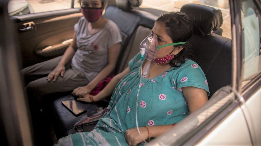 صورة تظهر سيدة مصابة بـ”كورونا” في الهند تستخدم الأوكسجين داخل سيارة. المصدر: getty
