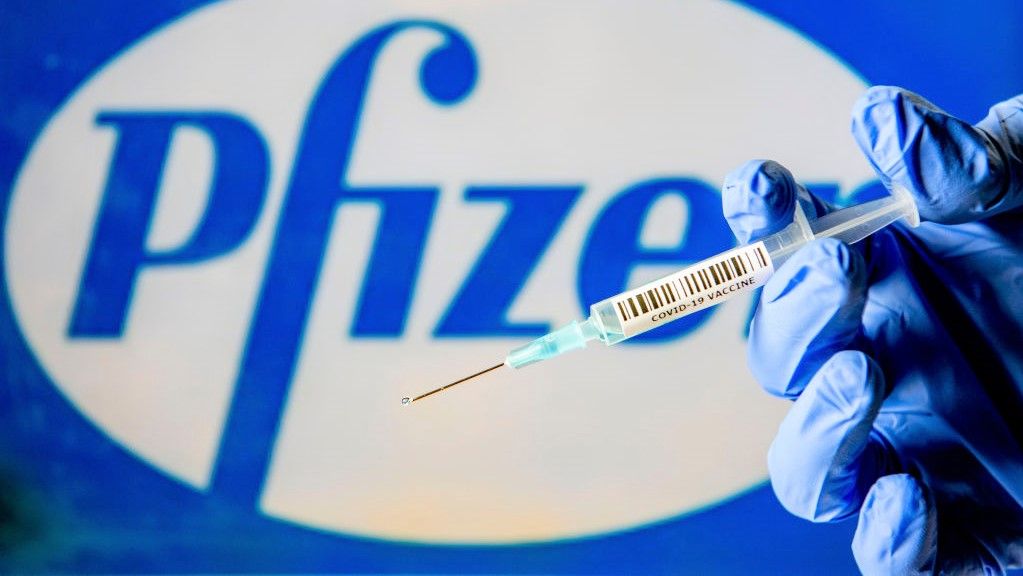 صورة تظهر حقنة طبية وفي الخلفية شعار شركة “فايزر”. المصدر: getty