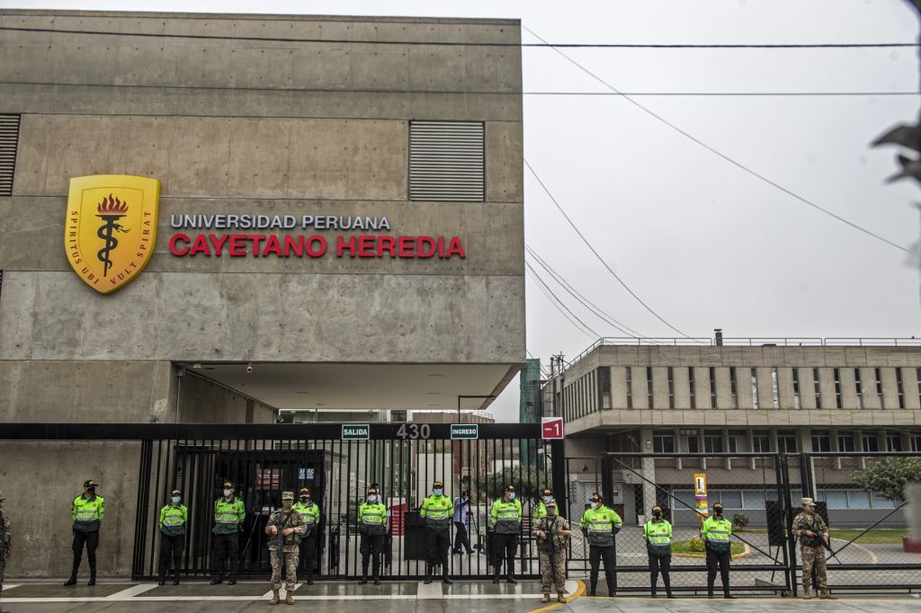 يقف ضباط الشرطة في جامعة كايتانو هيريديا في ليما حيث سيتم اختبار لقاح صيني محتمل ضد COVID-19 على المتطوعين. المصدر: أ ف ب