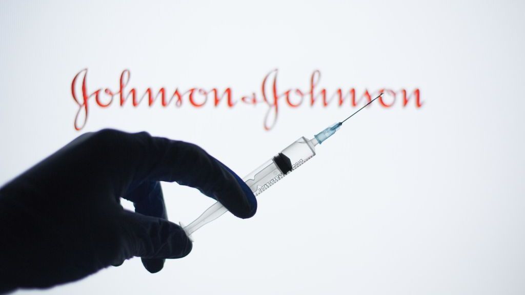صورة توضيحية تظهر حقنة طبية وفي الخلفية شعار شركة “جونسون آند جونسون”. المصدر: getty