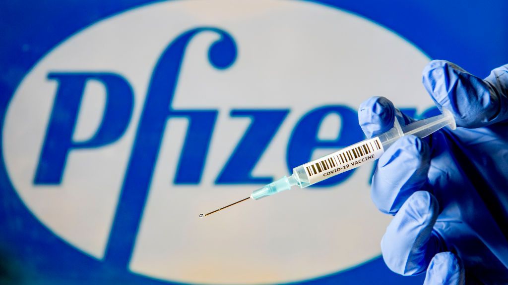 صورة لحقنات طبية وفي الخلفية شعار شركة “فايزر”. المصدر: getty